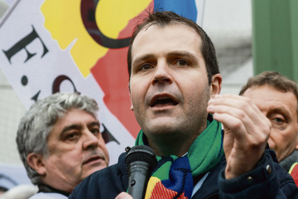 French FSU union leader Benoit Teste addresses a gathering of striking workers at the RATP bus depot of Vitry-sur-Seine, near Paris, on January 13, 2020, on the 40th day of a nationwide multi-sector movement against French government pension reform. (Photo by Ludovic Marin / AFP)